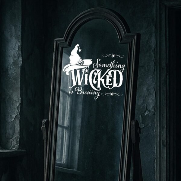 Add a dash of spooky charm to your Halloween décor with this “Something Wicked is Brewing” vinyl decal. Perfect for windows, mirrors, or glass doors, this decal features a whimsical witch hat, playful spiders, and eerie typography—just the right amount of wicked for your haunted home or salon!