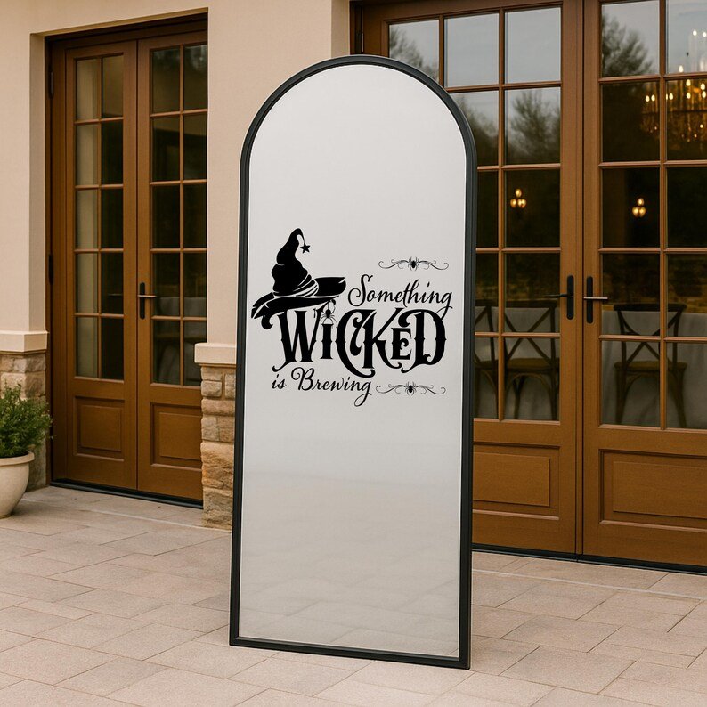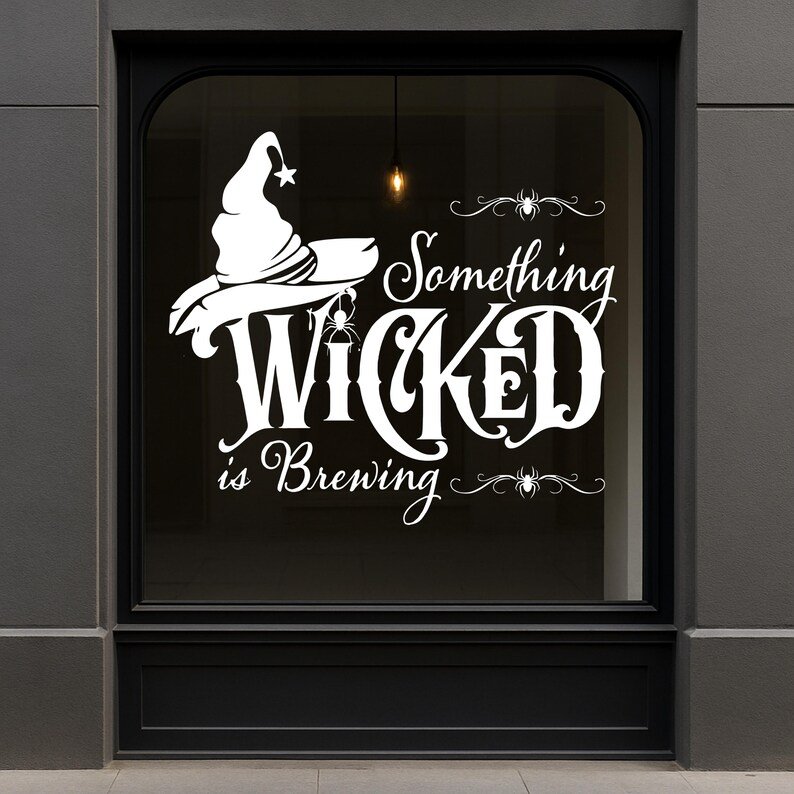 Add a dash of spooky charm to your Halloween décor with this “Something Wicked is Brewing” vinyl decal. Perfect for windows, mirrors, or glass doors, this decal features a whimsical witch hat, playful spiders, and eerie typography—just the right amount of wicked for your haunted home or salon!