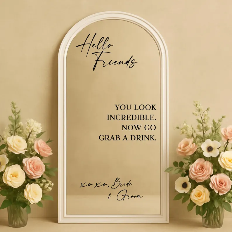 Welcome guests in style with this personalized wedding mirror decal that turns any arched or rectangular mirror into a modern statement piece. PLUS — with every order, you’ll receive a FREE 22” “Just Married” vinyl decal to use on your getaway car, photo booth, or honeymoon send-off!